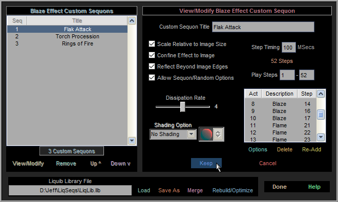 When creating a new Custom Sequon, the right portion of the screen will be pre-loaded with the information needed to re-create the Tool or Effect sequence that has just been rendered in the main Liquib screen. An appropriate Custom Sequon Title can be entered, and changes can be made to the Tool/Effect parameters as desired. This example shows the process of defining a new Blaze Effect Custom Sequon (the options are somewhat different for a Tool).