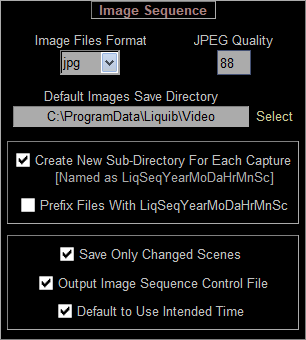 When using the Still Image Files Sequence Video Format, the Video and Audio Compression areas of the screen are replaced with Image Sequence options. Sequential still images will be saved in the selected Image Files Format (i.e. jpg, png, tiff, etc.) A Default Images Save Directory can be chosen by pressing the Select button. Optionally, a new sub-directory can be created to contain image files for each capture. Image files will be saved with sequential 8-digit numbers, which can optionally be prefixed with the current date and time. The Save Only Changed Scenes option will output an image file only when the display has actually changed, potentially saving much disk space. Otherwise, images will be saved at the specified Capture Frames/Second rate. Check the Output Image Sequence Control File option to create a small file with each capture that contains timing information for each image frame. The Sequence Control File can be used with the Image Sequence Player to provide much greater control over the playback of captured Image Sequences. The Default to Use Intended Time option will play sequences back by default according to the Intended Times for frames (as recorded in the Sequence Control File), instead of the Actual Times.